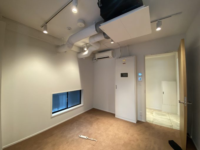 四角くくり抜いたような吹き抜け天井は、天高4.6m!かなり見上げます。建築にあたり、ある程度出来上がった後に天井を抜かれたらしく、きっとかなり印象が変わられたと思います。南東向きのため、下側の窓からも十分光が入るのですが、吹き抜け側の窓からもさらに光が差し込みます、、お昼間は電気いらずです。
