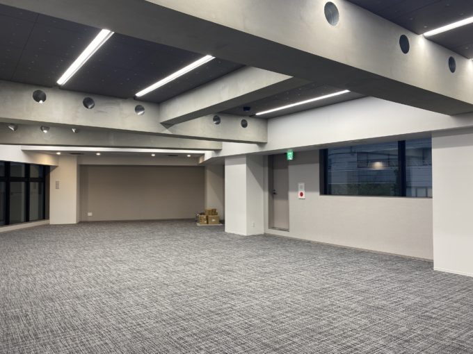 まだまだ新築の雰囲気が残るこちらのスケルトン区画。入り口は自動ドアで作られています。地下への動線は、エントランス側の直通階段と、1階の室内から降っていく階段の2箇所あります。間取りとしては台形のような形になっており、1階は配管と考慮して床の段差があります。存在感のある柱も、眺めていたらだんだんと愛着が湧いてきます。西側の窓面からは、今の時期は緑を望むことができるため、無機質なスケルトン空間に柔らかさを与えてくれています。
