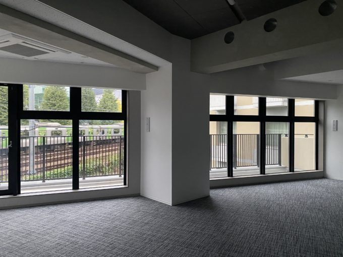 建物西側はJR各線が走っているのですが、防音措置がされているため騒音がすごく気になる..というわけではありません。ひとつ気になるとしたら、事務所区画の窓面まで近づいて外を見たときに、自治体によって保管されている工事道具がチラリと見えるところ。景観重視の場合は気になるかもしれませんが、その先には神宮通公園の木々が存在感を示してくれるため、四季の移ろいを楽しめることは間違いないです。