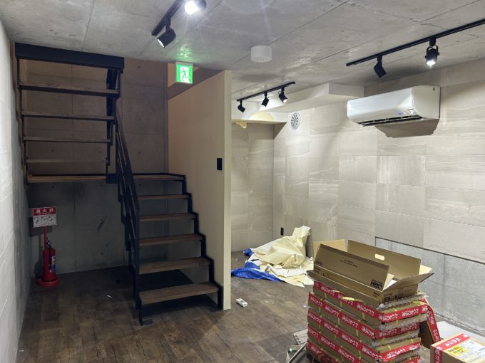 階段横にはくぼみスペースがあるので、仕切ることで収納スペースやオンラインスペースなど色々なレイアウトができそうでした。また写真では壁に白いタイルが貼られていますが、入居時には全て剥がされレンガがむき出しな状態になります。