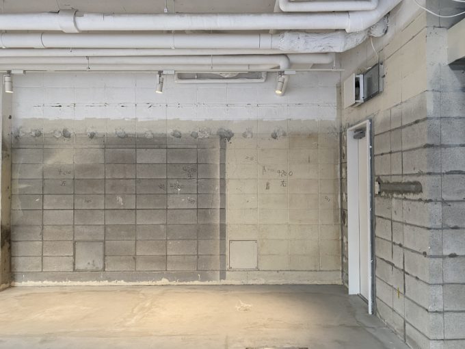 入り口を入ると、部屋全体コンクリートの壁や床が広がっています。全て同じ色ではなく、白やグレー、暗めのグレーなど色々な色が混ざっています。また壁にはスケルトンならではの模様があり、クールで洗練された空間に遊び心がプラスされていました。