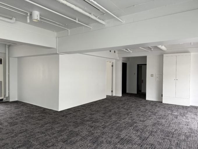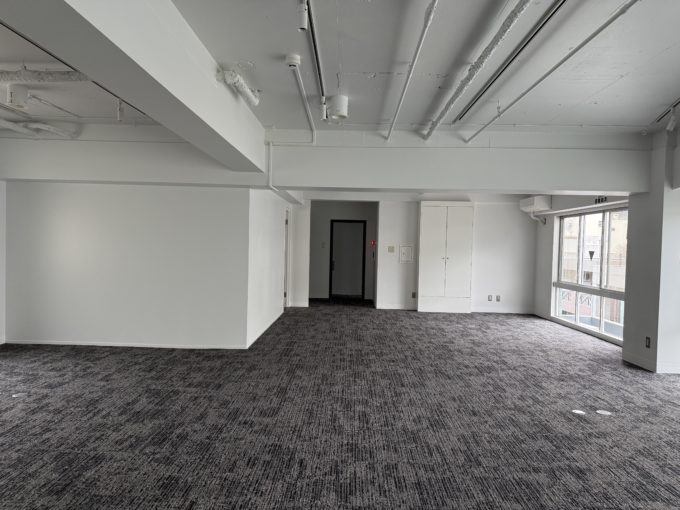 今回はそんな建物の、事務所仕様の区画と、天井のみ抜かれたセミスケルトン区画の2フロアが同条件で募集中。