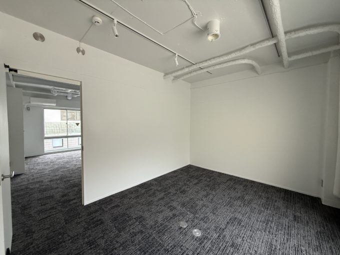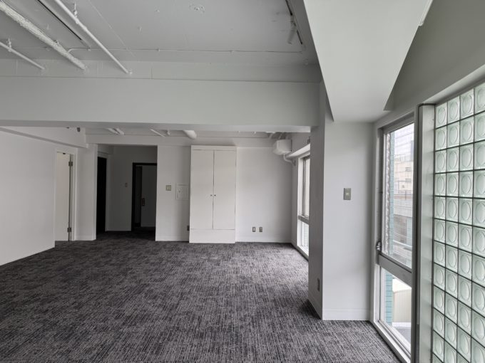 一部窓はガラスブロック。天井は抜かれた上に白塗装が施してあって、床は霜降りタイルカーペット。家具とPCと身体さえ持ってきたら、すぐに稼働できちゃう内装です。