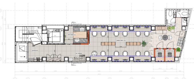 内容:12名用の席、WEB会議ブース2、4名用会議室、スタンドミーティングスペース