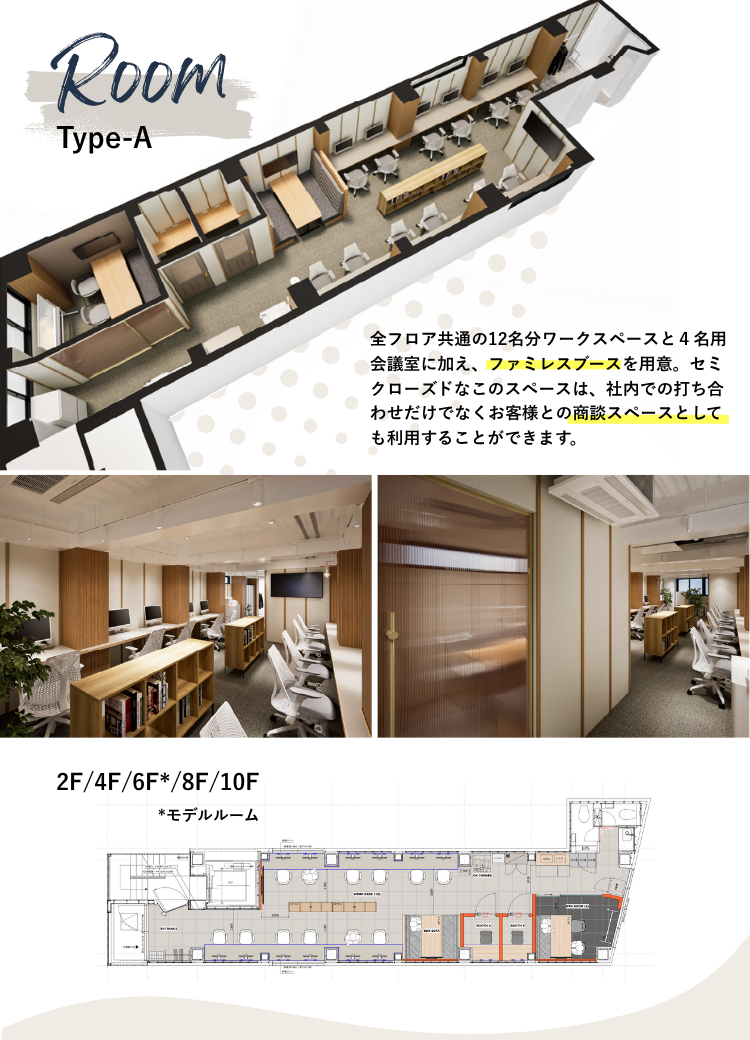 内容:12名用の席、WEB会議ブース2、4名用会議室、ファミレスブース