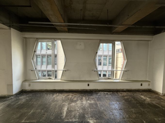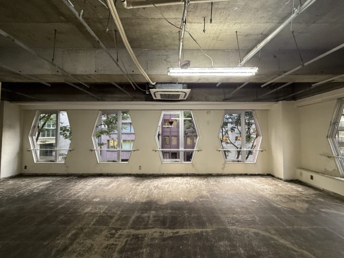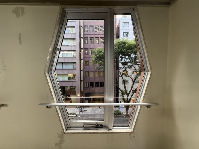 この広々空間に、六角形の窓とスケルトンのマッチはとても雰囲気のある空間になっていました。