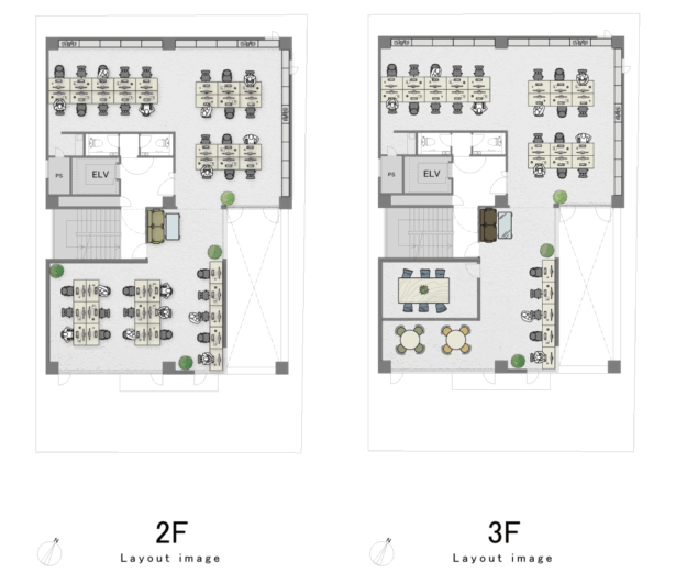 2F〜3F:事務所・ショールームやスタジオなど、クリエイティブな用途にぴったり。天井高もあり、窓からの光が気持ちよく差し込みます。
