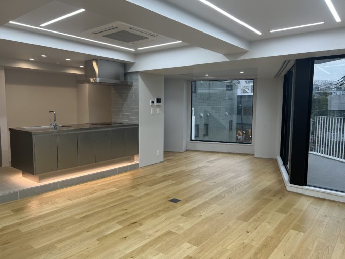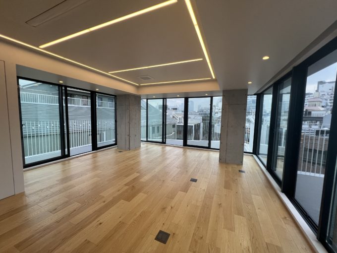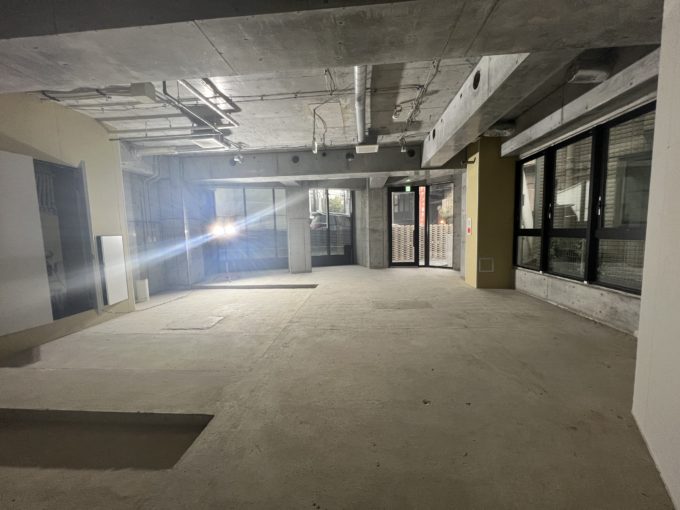 地下1階+1階はスケルトン空間。真っさらな状態だからこそ、入る人の世界観をそのまま反映できる余白があります。大きなクリアガラスが、外からの光を柔らかく取り込み、コンクリートの質感をより洗練された印象に見せてくれます。2.5m以上ある天井高も相まって、地下でありながら圧迫感を感じにくいのが特徴です。