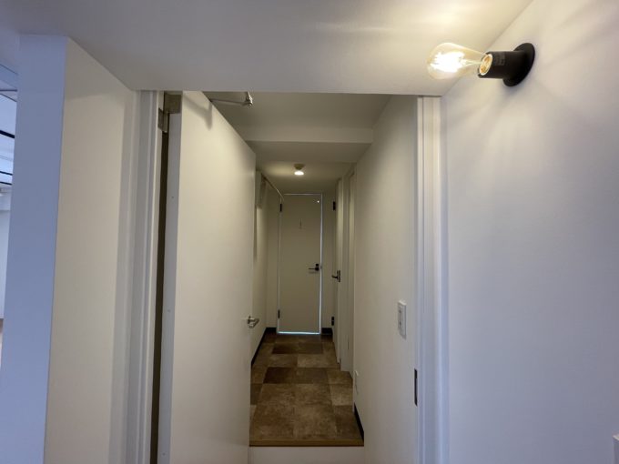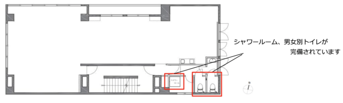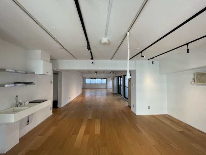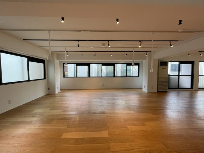 扉を開けた瞬間、ライティングの雨。黒いスポットライトに加え、白いソケットが天井が降り注いでいる。もうすでにおしゃれ、デスクや家具を置いたらかっこいい空間の出来上がりだ。全方位に窓があるのも嬉しいポイント。窓が多い北側と、西側には建物が隣接しているが、建物入り口側は前が道路で開けていて東向きで明るい。水回りは白基調で新しく、トイレは嬉しい男女別だ。