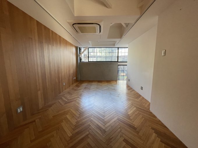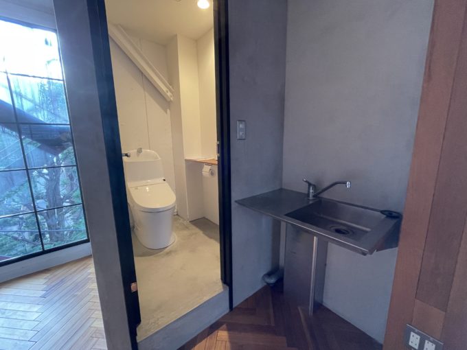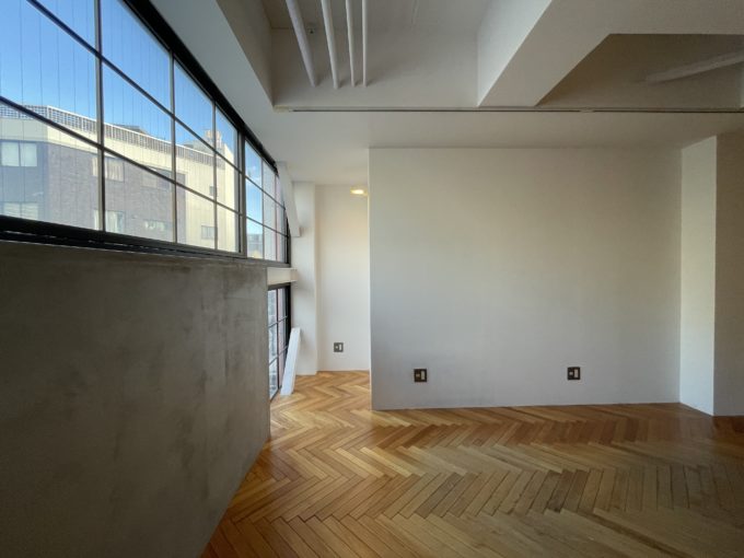 前のテナントはデザイン会社だったそうで、納得の内装です。壁の一方はホワイト、もう一方は木目、トイレや一部の壁はモルタルのグレーと配色がなんとも秀逸です。窓枠は洋風な黒格子で細部まで統一された世界観がかっこよいです。エレベーターなしの3階になりますので、幅感など現地でお確かめください。