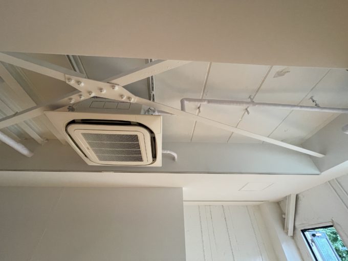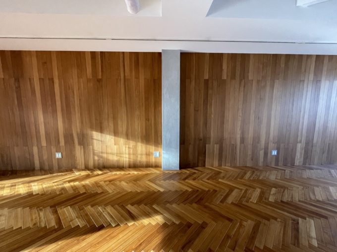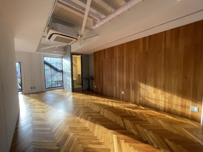 以前のテナントが作られたおしゃれな内装だ。床はヘリボーン調で、白い壁と一部抜けた天井が長方形のボックスに解放感をもたらしている。南北に窓があり、3階部分のため日当たりも良く、トイレ横の非常階段の扉から西日が差し込んでいた。空間に区切りはないが玄関側、階段付近に奥まったスペースがあり、備品や在庫置き場として使えそうだ。