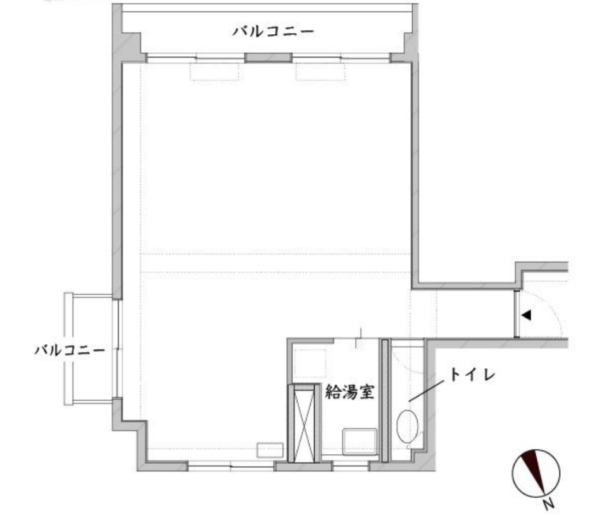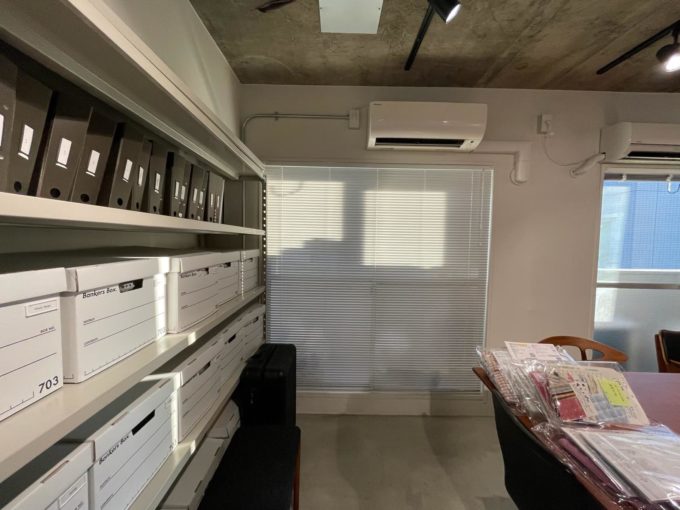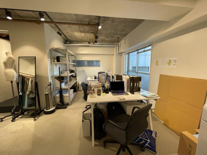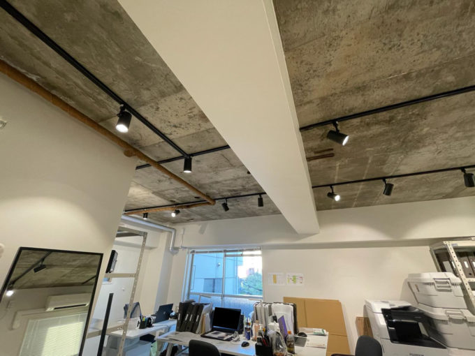 現在ファッション系の事務所として利用されているこのお部屋。古い建物ながら、共用部分の廊下や階段もなんだかおしゃれに手入れされている。お部屋も天井が抜かれていて、床もコンクリ、壁は白く塗られていて清潔感がある。