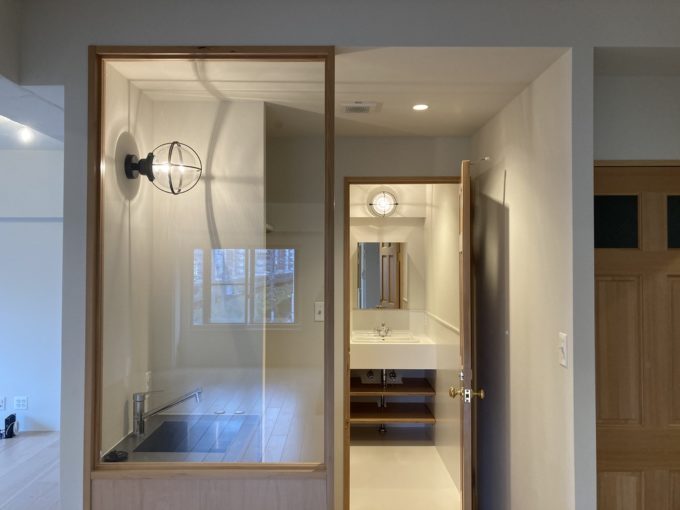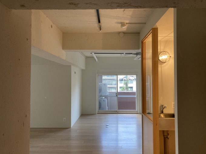 2021年にフルリノベーションされたこの物件。明るい色のフローリングに白い壁と天井が開放感を与えている。水回りも一つ一つ凝っていて、洗面台のライトが船の照明みたいでキュート。モルタル床の個室は5人程度の会議スペースとして使えそう。フローリング部分も土足での使用可能。