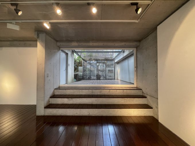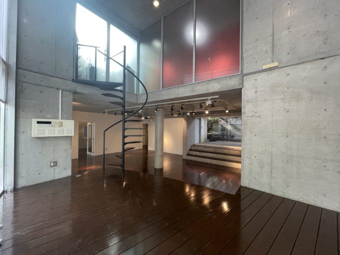 1階部分の大きな窓とコンクリ打ちっぱなしの外観はなんとも代官山らしい。入り口入ると天高4mの開放的な空間が広がる。室内壁や天井が打ちっぱなしのコンクリ剥き出しスタイル。床はまるでウッドデッキのような濃い茶色のフローリングが施されている。2階へと続く螺旋階段があるが、2階部分は先に入居者が決まったため使用はできない。鍵がかかっているのでお互い出入りはできません。階段を二段降りたところのスペースはやや天高が低くなるが、十分な高さだ。大きな窓ガラスの奥にはまるで旅館のような中庭がついている。こちらも専有部分として使用可能。隣には個室があるため打ち合わせやショールームなどにする場合は事務スペースとしても使えそうだ。扉がついているため、外から個室へ直接アクセスすることができる。