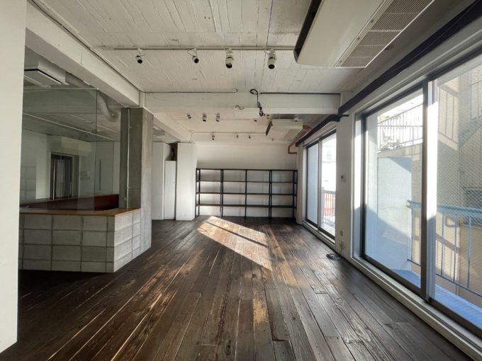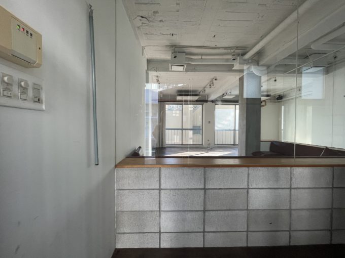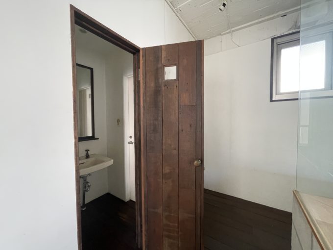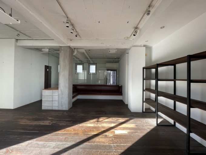 コンクリートブロックとガラスで作られたソファースペースがある。室内にあるコンクリートブロックはなぜこんなにも萌えるのだろうか。歩くときしむ無垢材の床がこりゃまたエモい。トイレの扉や室内壁面に置いてある棚には古材が使用されており、古民家リノベのようなレトロ可愛さがある。天高は2.6mだが体感もう少しあるように感じる。