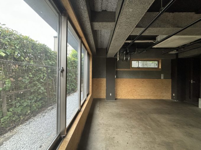 築3年と外観もパキッと新しいです。今回ご紹介するのは1階の店舗区画。建物正面左手が店舗区画の入り口です。ガラス扉をあけると、小スペースを経てさらにガラス扉が。廊下を進むと正方形のスケルトン空間がありました。