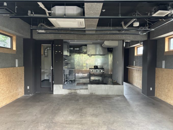 室内の床はコンクリ、天井と壁は一部木毛セメント板です。空調も計3台あり、キッチンエリアに1台、トトロエリアに2台あります。