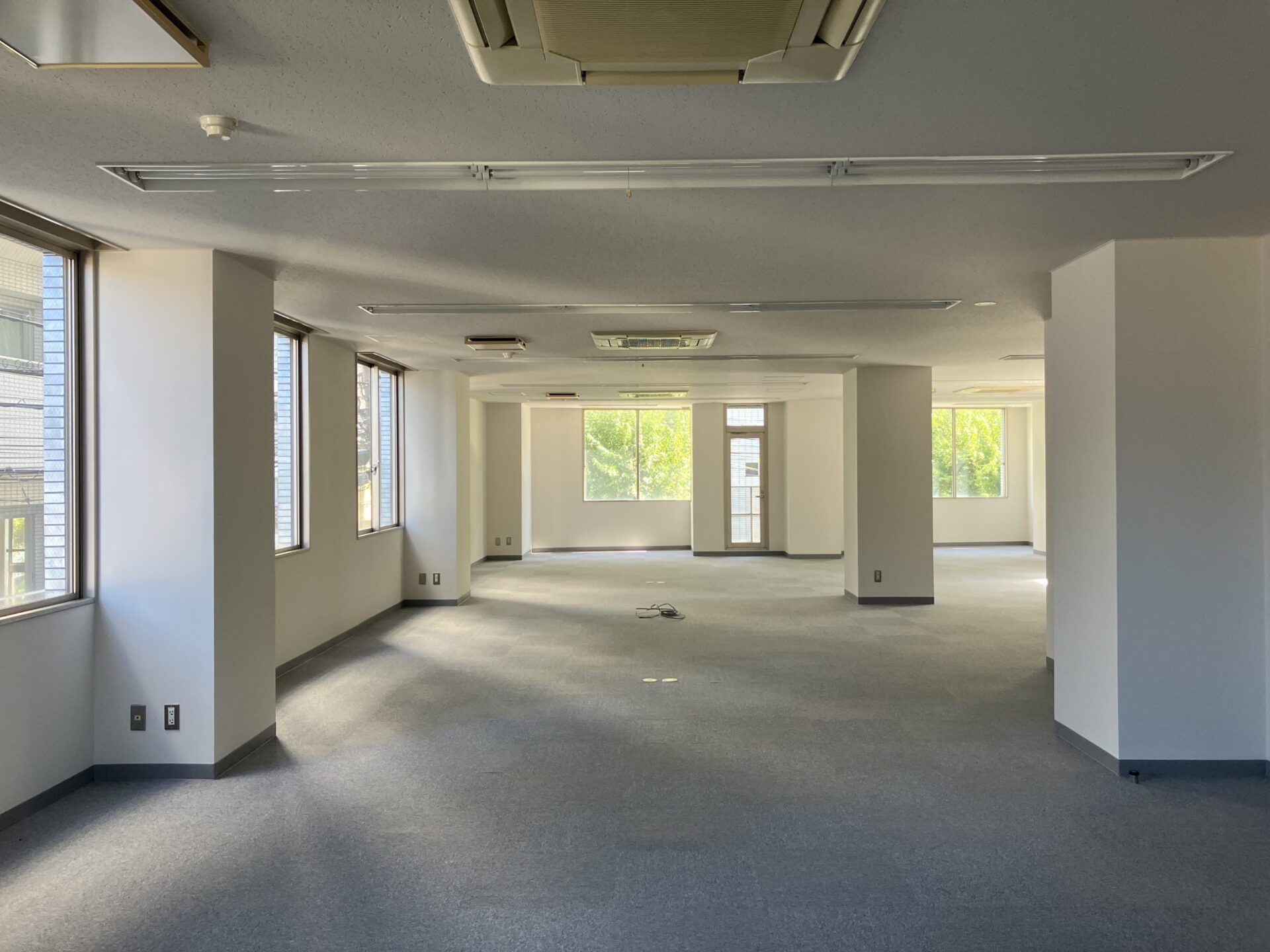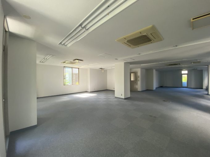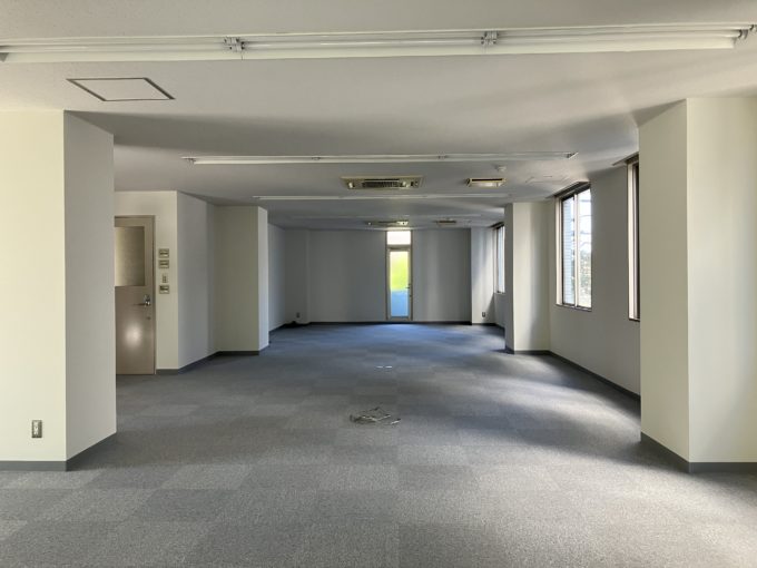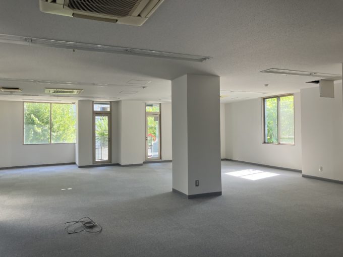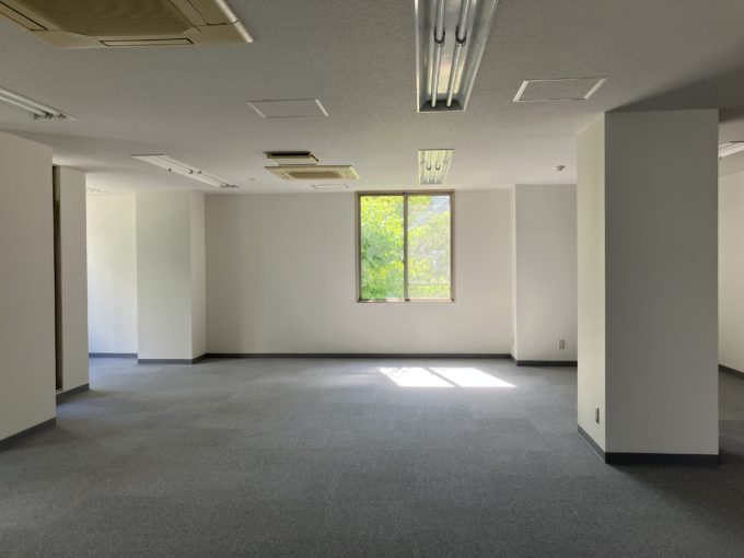 以前は有名なキャラクターの制作会社様が使われていたようで、シンプルなカーペット床で事務所仕様ではありますが、贅沢な4面彩光が夕方には差しこむ素敵な空間です。緑豊かなオフィスには、風になびく木々を眺めていたら、ふっとアイデアも思いつきそう。