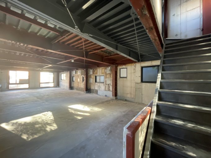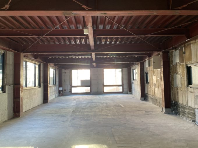 室内は、フルスケルトンです。赤い鉄骨が工場味あります。窓から見える渓谷の緑とのコントラスが素敵です。
