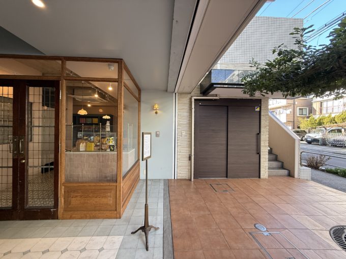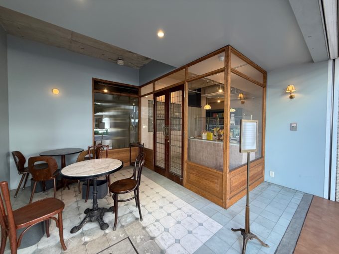 店外にはテーブル席が2つほどあり、その部分の床にはタイルが敷かれていました。
