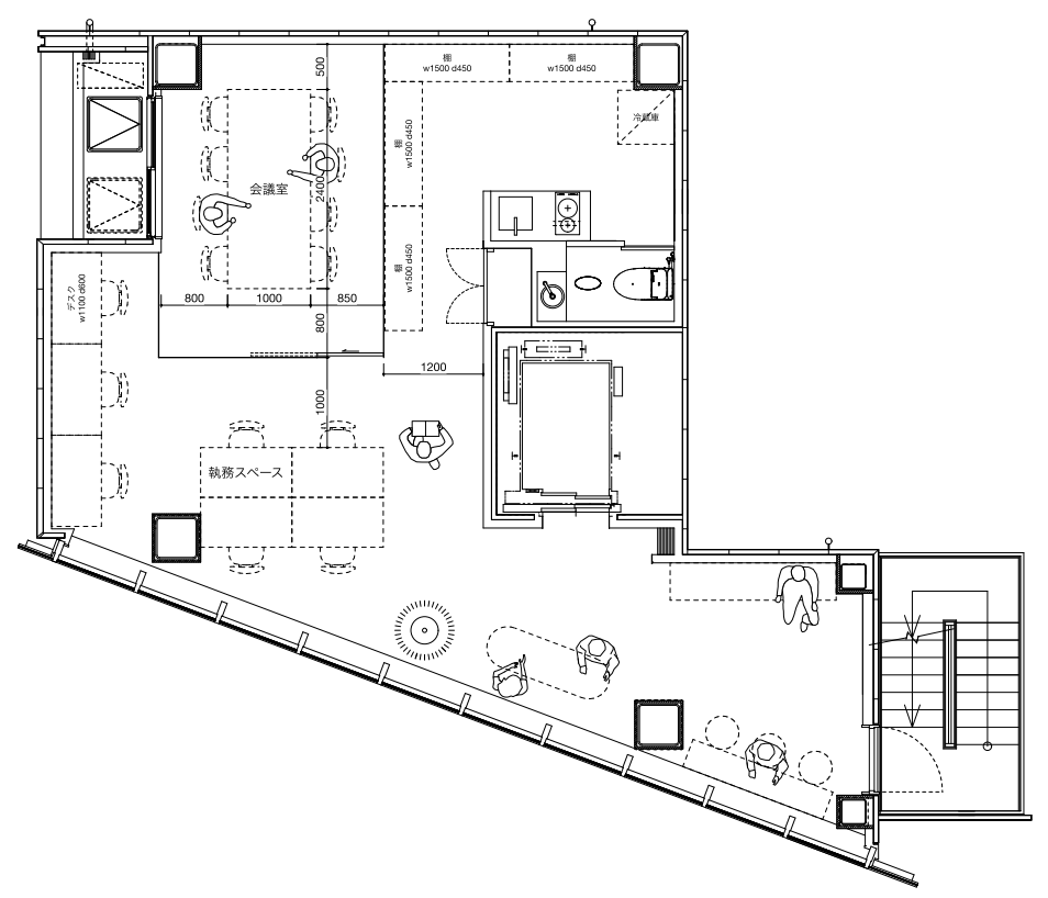 例えばエレベーターから降りて左手には来客スペースを設けるのはどうでしょうか。右手の窓側にはテーブルをくっつけて、景色を眺めながら作業や休憩スペースとして使ったり・・妄想が膨らみますね。