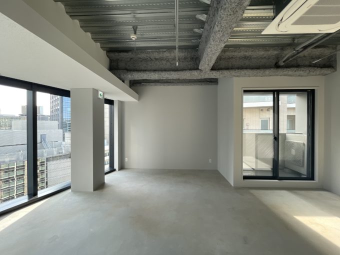 Syncs kojimachi Bldgもシンプルなコンクリート打ちっぱなし仕上げの空間に、ダクトレールが設置されている。