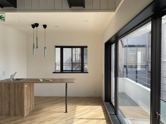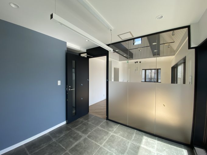 この吹き抜け部分、なんと天高最大4.6mなのです!アーチ型の窓が、空をかわいらしく切り取ってくれています。メインのお部屋は南向きということもあり、日中通して明るいです。また、ガラス壁で仕切られたお部屋も印象的。床材がフローリングではないので、雰囲気がガラリと変わります。MTGスペースに良さそうです。