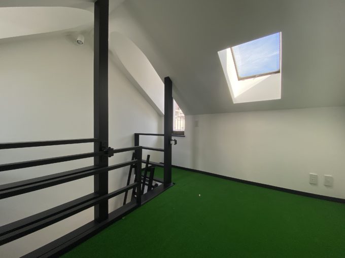 そしてもう一部屋も、天井が波打ったような出立ち。そしてロフト付き!結構急なロフト階段ですが、上がった先は人工芝が敷かれているのと、天窓があります。完全にお昼寝ゾーンです。