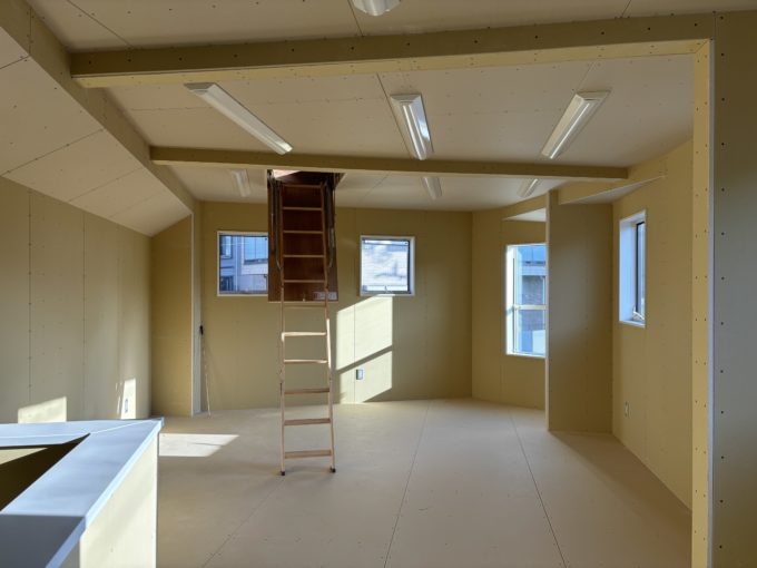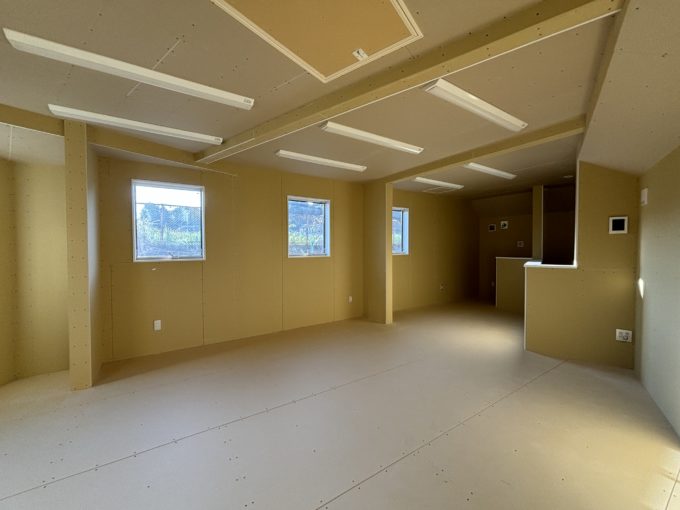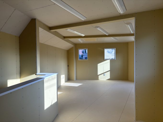 1階部分には家庭用キッチンと、多目的仕様のトイレが新設されています。天井、壁はすべてボード仕上げの下地状態。1階は天高2.6m。室内の階段を上がって、2階にいくと西陽がたくさんの窓から差し込んでいました。南東から南西向きに小窓がたくさんあるので、1日中明るそうです。