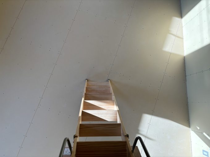 さらに面白いのが、2階には屋根裏部屋があるんです。シャッターを閉める要領で金具に引っ掛けて、天井を引くと階段が出てきました。もう面白い。スペース的には畳2畳分ほどの空間がありますが、完全に倉庫です。ただちゃんとコンセントも照明も窓もありました。2階は天高低めの2.3m。