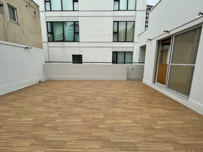 4階は木目調ビニルタイルで、アットホームな感じがします。この区画の魅力はなんといっても広々としたバルコニーで、3Fは約19㎡、4Fは44㎡の専用テラス付き。4Fは執務スペースよりもバルコニーのほうが広く、壁と建物に囲まれていてまさにプレミアムオフィスです、会社に集う仲間のリフレッシュスペースとして、ノマドワークスペースとして第2のオフィスの運用など働き方をアレンジしてくれます。