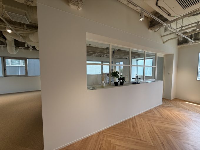 オフィスはアーチ型の可愛らしい扉を抜けると窓が全面にある開放的な空間が広がっています。