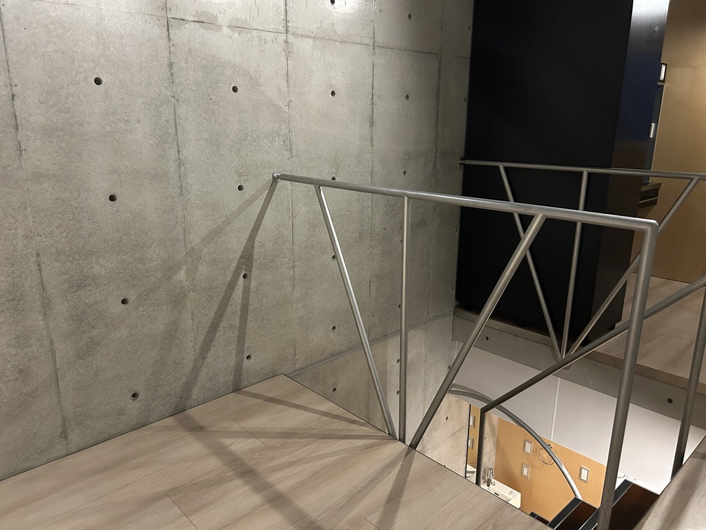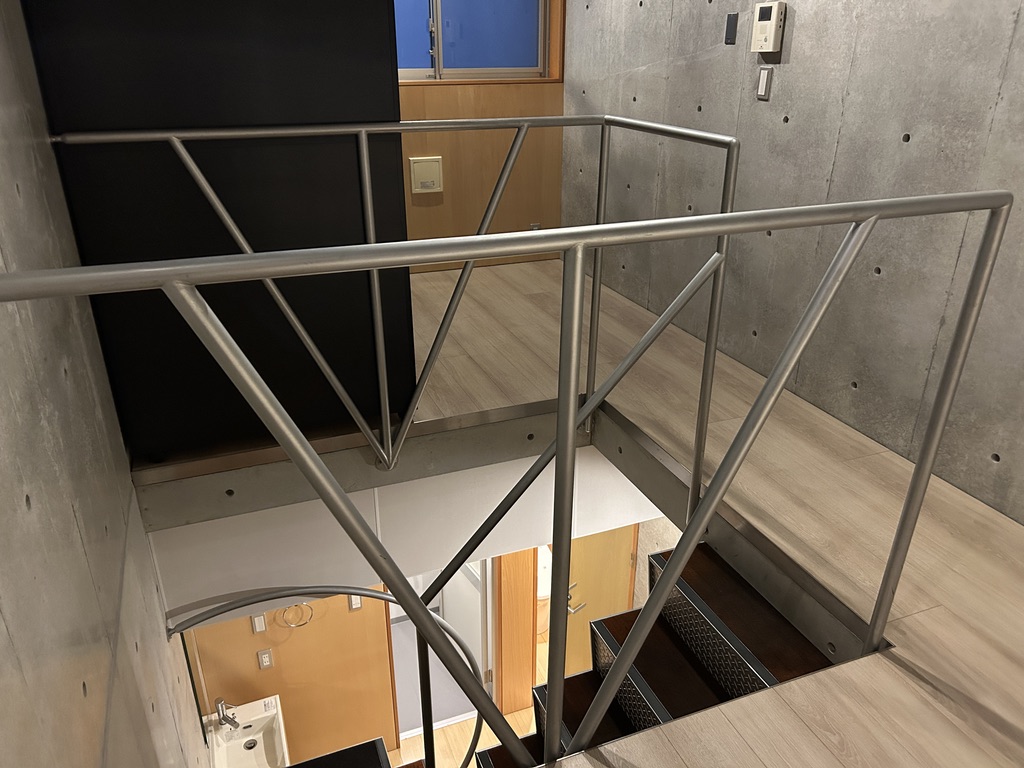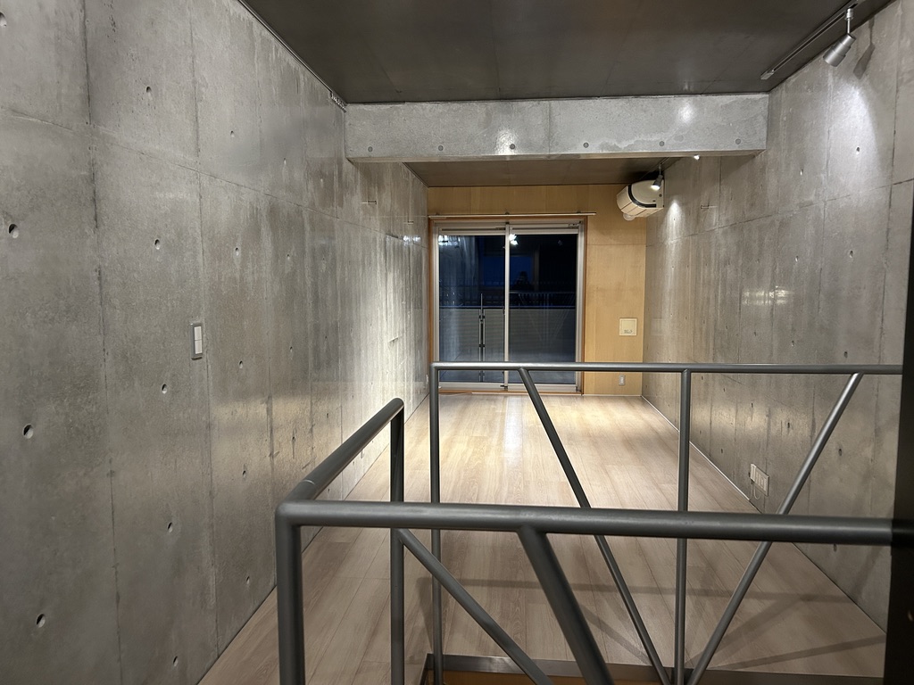 階段で上に上がると、縦長ワンルーム。階段の手すりがぐいーんと丸く曲線を描いていて、