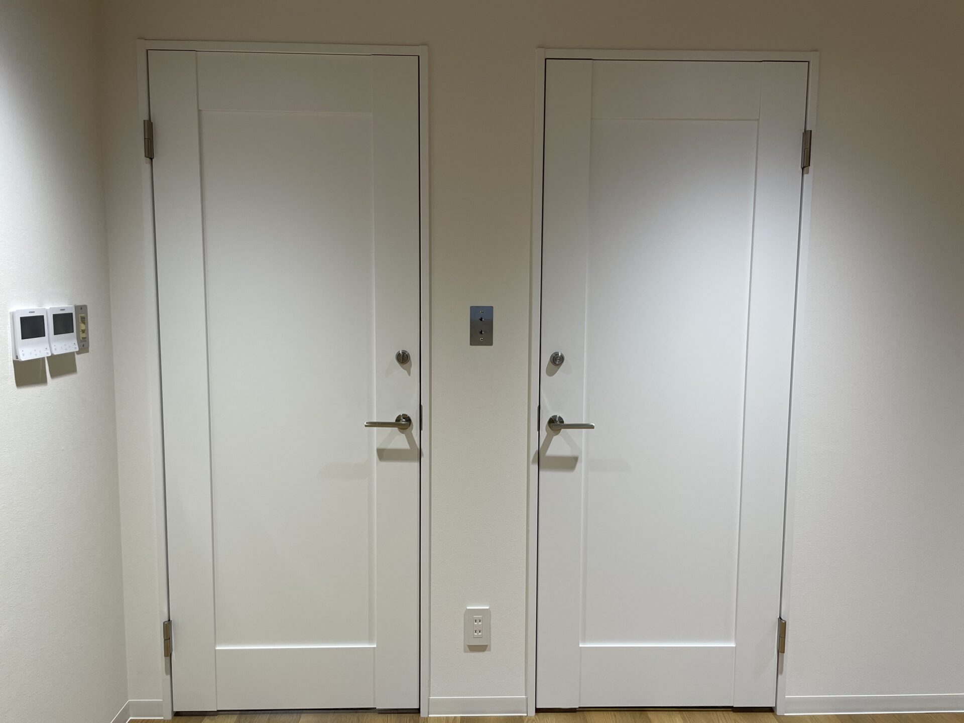 ライトスイッチのシルバーで無駄のないフォルムに、真っ白な左右対称の扉も見ていて気持ちがいい。