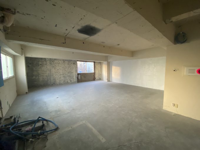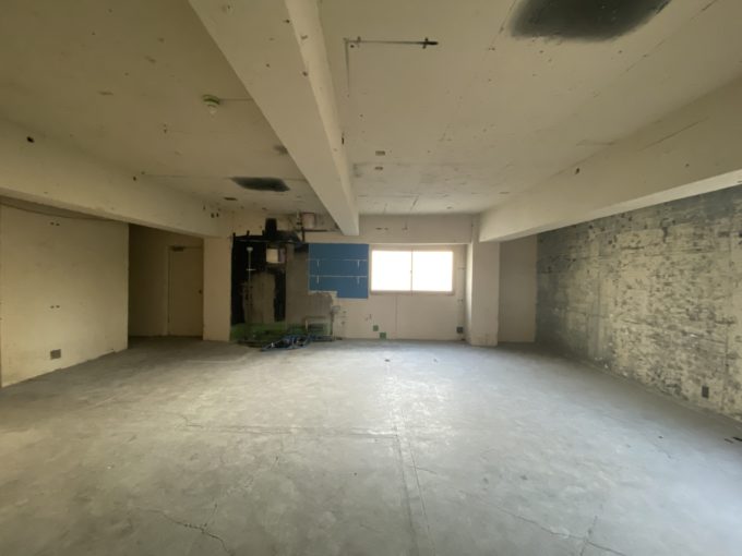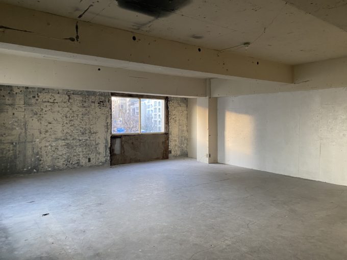 5階は完全なフルスケルトンで、白の躯体現しがいい味出ています。床はコンクリ床。モルタルっぽくも見えます。ひび割れもアジです。空調や水回りの工事は必要ですが、躯体の味を生かして作り込みたい系です。バルコニーへは鉄扉なので日当たりは小さめの窓2つです。