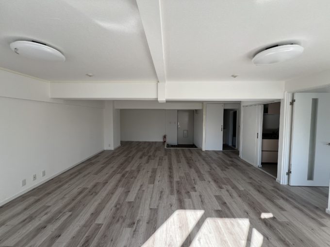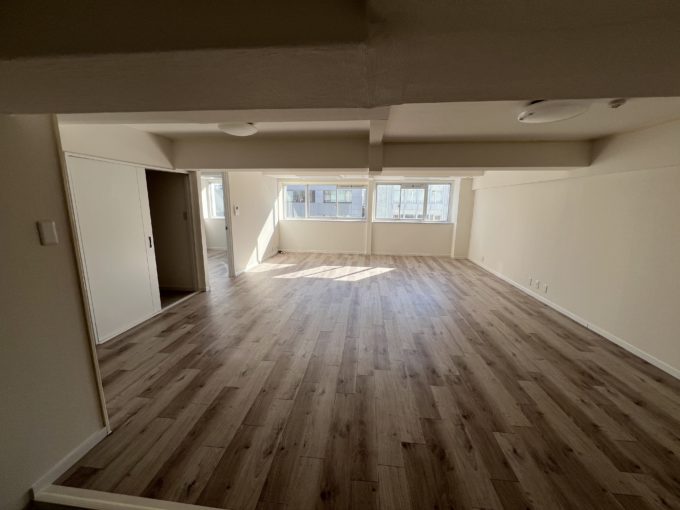 室内は住居仕様になっており、40㎡ほどのLDと10㎡の洋室があり、ほかトイレ、キッチンもあります。洋室をそのままミニ会議室にして、広いほうを執務スペースにして使うというシンプルな使い方ができそうです。洋室のほうにも窓があるのが嬉しいですね。丸型のよくある照明が実家感すごいので、せめてもエジソン電球のソケットシーリングライトとかに変えたい気持ちはあります。