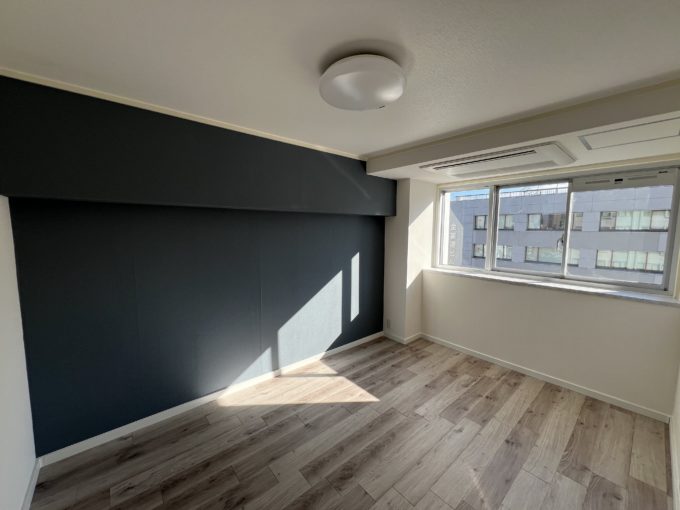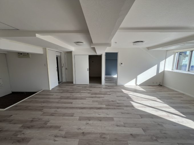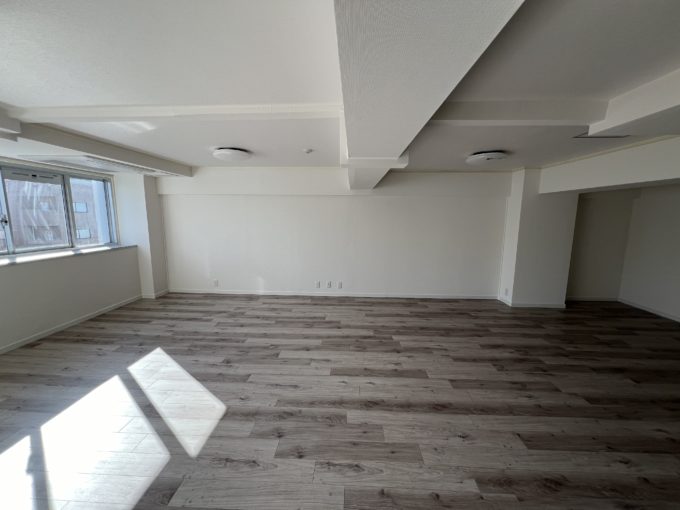 部屋に入ると正面の窓から暖かい日差しが。募集区画は9階のため日陰を作るような建物が無い分、日光が沢山入ってくるため、日が出ているうちは照明をつけなくてもいいくらい明るいです。