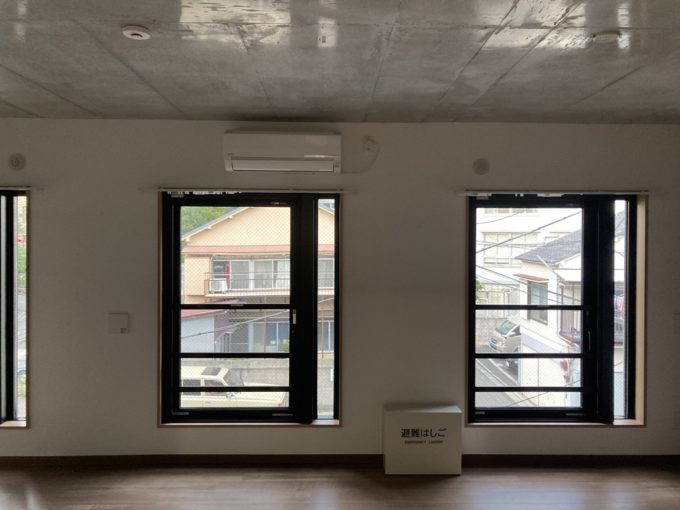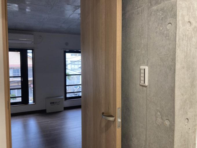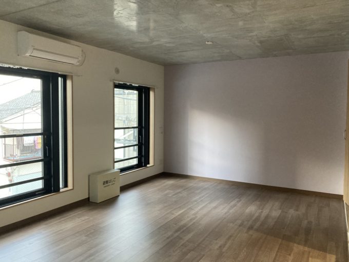 2022年9月に完成したばかりの新しい物件。コンクリートのモダンな外観、お部屋も天井がコンクリートで大人っぽい雰囲気。エステ利用可能、ペットも飼育可能だ。コンクリートを中心とした色味の中で壁の一面がラベンダー色になっていてアクセントになっている。エレベーターはなく、3階までは階段のみ。
