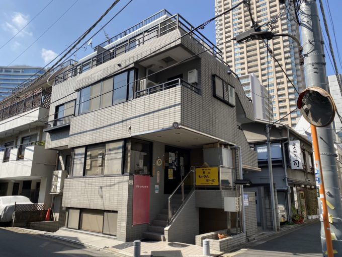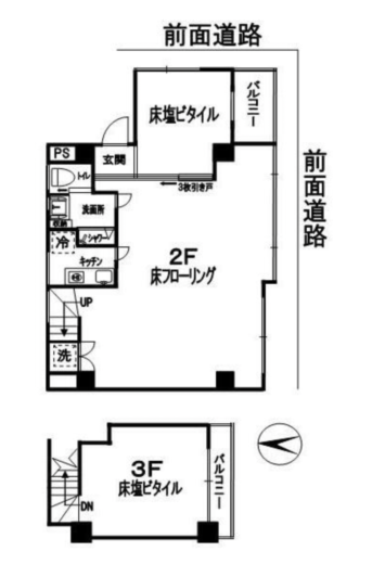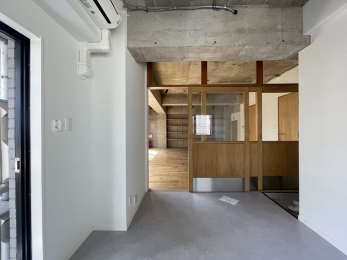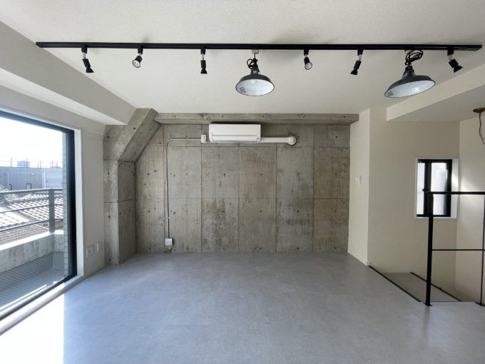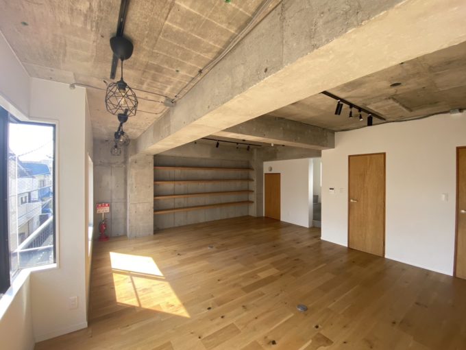 住居をぶち抜いてリノベーションしたであろうこちらの区画。玄関入ってすぐ右側には土間スペースの様なものがある。こちらのスペースとメインのスペースの間にはスライド扉がありスペースを区切ることができる。扉の先にはトイレ、シャワー、キッチン、洗濯機置き場が隠されている。少し手狭な階段を登り3階部分には6畳ほどのスペースとベランダがある。外観からは想像できない可愛い内装に仕上がっている。