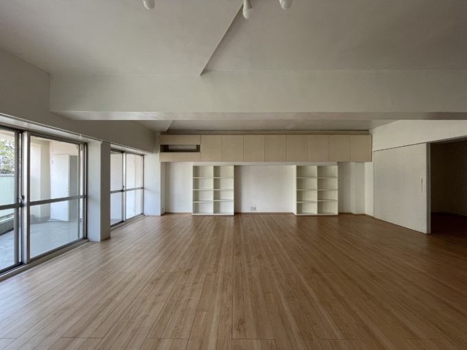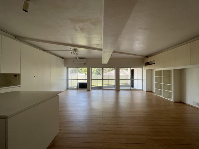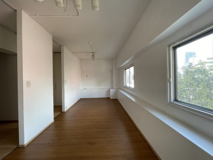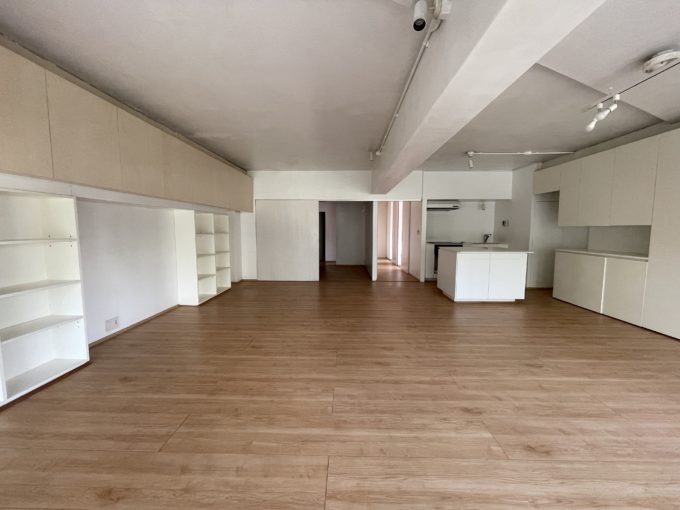 坂を登って辿り着くこちらは表記の6分より体感長く感じられる。外観はパステルピンクとレトロ可愛い印象だ。一階部分は駐車場となっている。お部屋は2LDK。個室がふた部屋あるため、ストックルームや打ち合わせスペースなど様々な使い方が想定できる。LDK部分の壁面にはびっしり壁面収納があり、収納力抜群。と思いながら、バルコニーを除くと、なんとバルコニーに押し入れが!?びっくりしました。何が起きているのかパニックになりかけたが収納にはまず困らなそうだ。