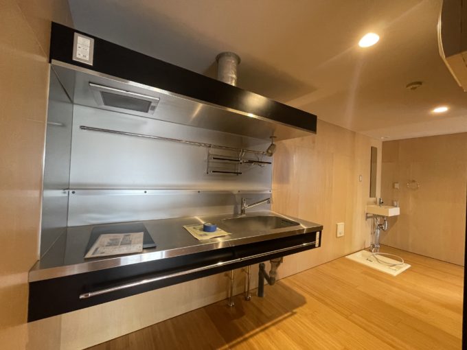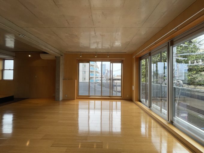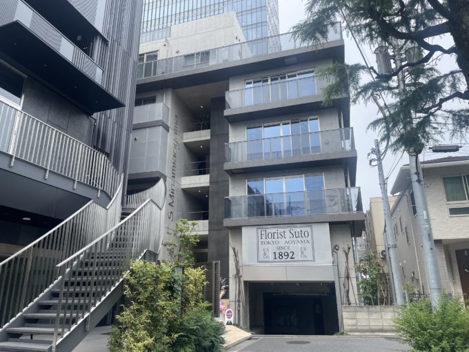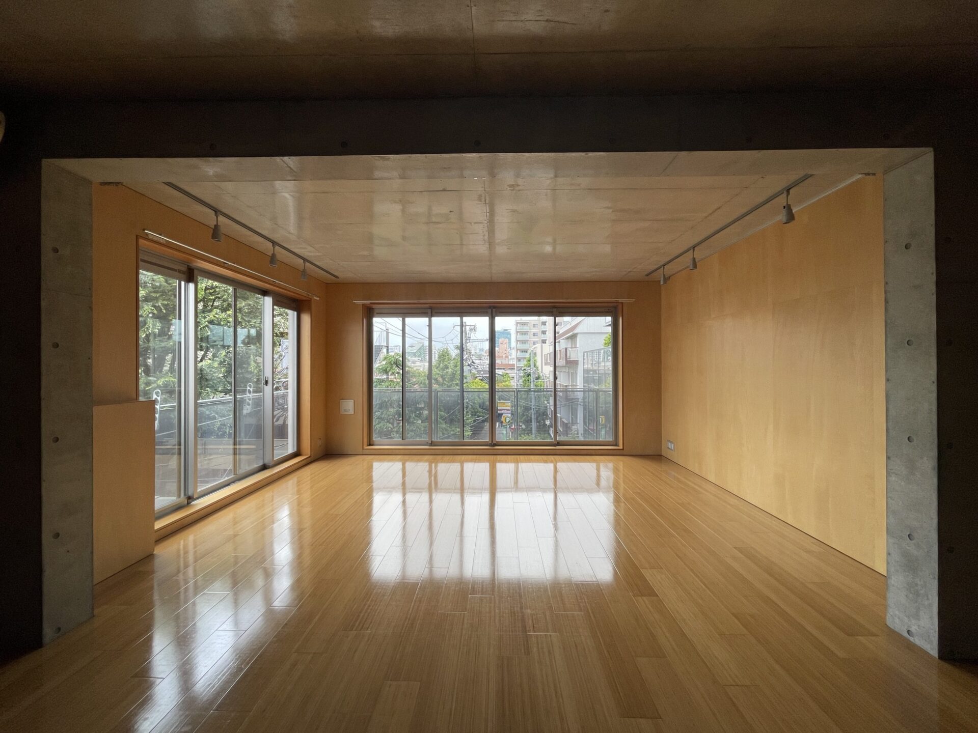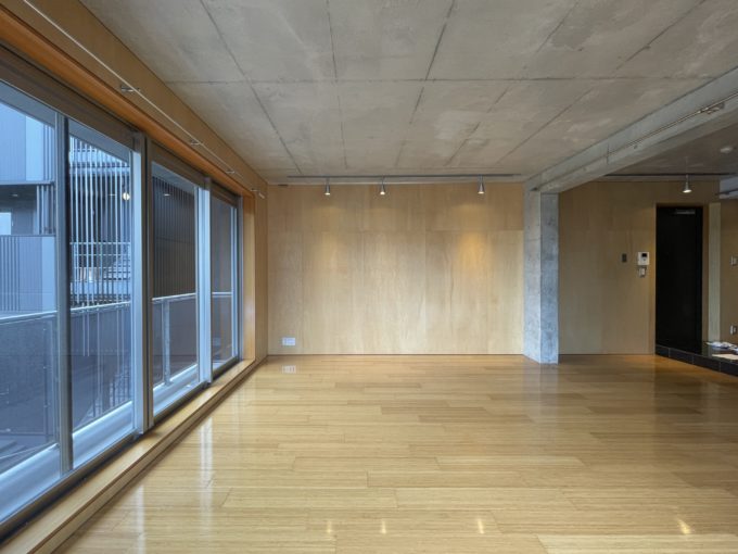 表参道と外苑前の間、青山通り至近。目の前には公園がある。コンクリート打ちっぱなし、ガラスのバルコニーと透明感のある外観に惹かれる。1階にはお花屋さんが入居しているため、エントランスには花が生けられており、非常に華やかだ。扉を開けて右側の室内はコンクリに壁はウッド調。大きな掃き出し窓が二面あり、窓からは緑が見える。左側には可動式の収納棚の裏側に浴室、トイレ、キッチン、洗面台がまとまっている。青山通りからもすぐだが、周辺は非常に閑静で、隠れ家サロンにピッタリだ。