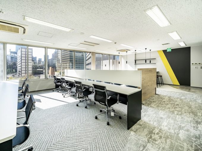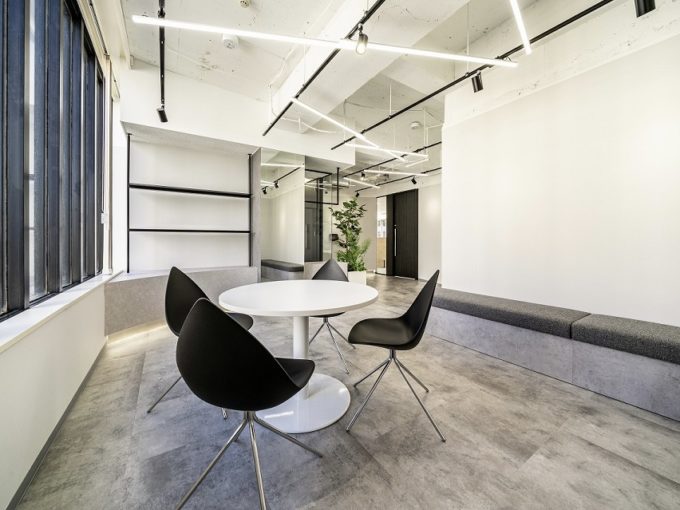 エレベーターから6階まで上がると天井が抜けたおしゃれなエントランス兼MTGスペースとなっています。白く塗装されたスケルトン天井がスタイリッシュな印象を与えます。窓は南北に2面広くとられ、片方が外堀通り方面ですので開放感があります。25名用のワークスペース、会議室、社長室がある使い勝手のいいオフィス。