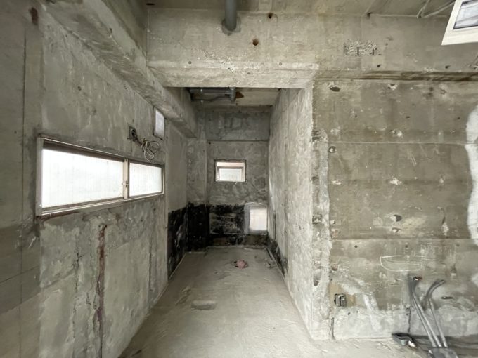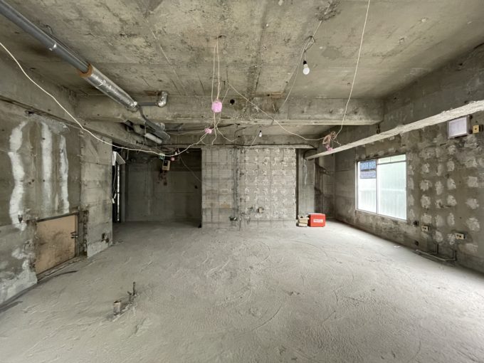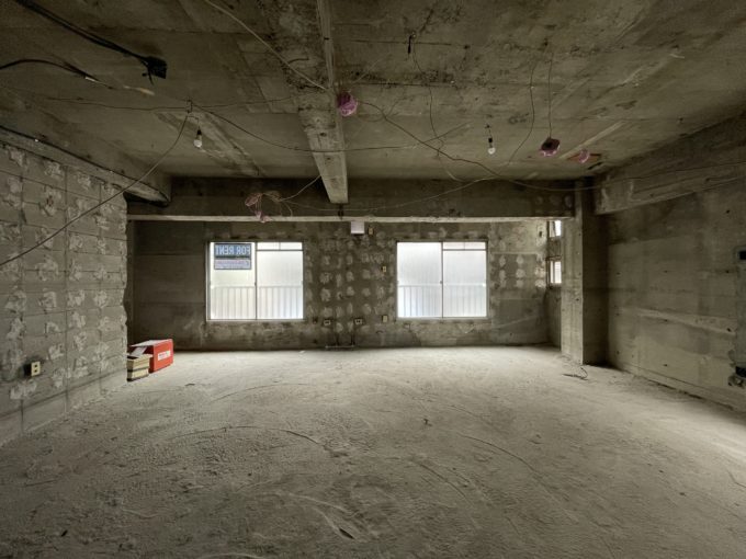 大中小と極小の窓が並んでおり、個性を感じる。そう、スケルトンと一括りにしても全てに個性があるのだ。その個性を書くのが私の仕事だと再確認したところで、物件紹介に戻ります。周辺には時間貸し駐車場があるので、ファミリー向けの飲食店はどうだろう。完全スケルトンなので水回りなど自分好みの空間作りを楽しんでください。