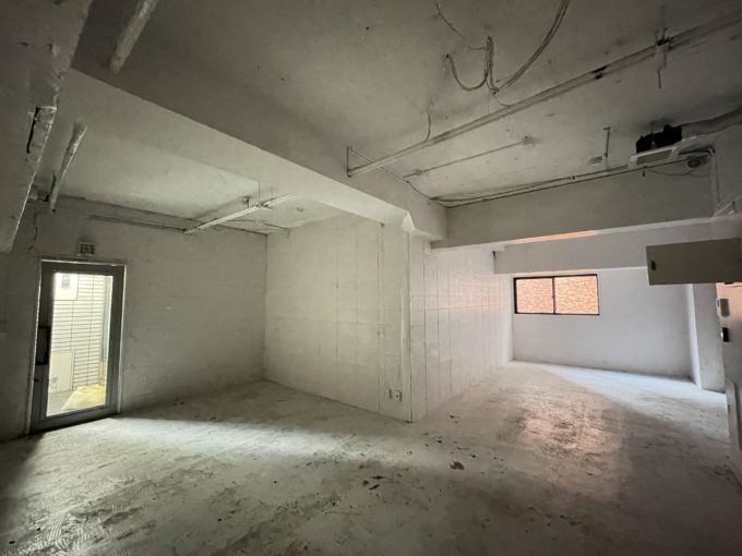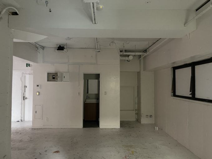2階から上が募集出ており、スケルトンは2階と3階のみ。2階は直接階段からアプローチが可能で隣には美容室が営業中。2階の区画は無機質な白スケルトン、これぞスケルトン。