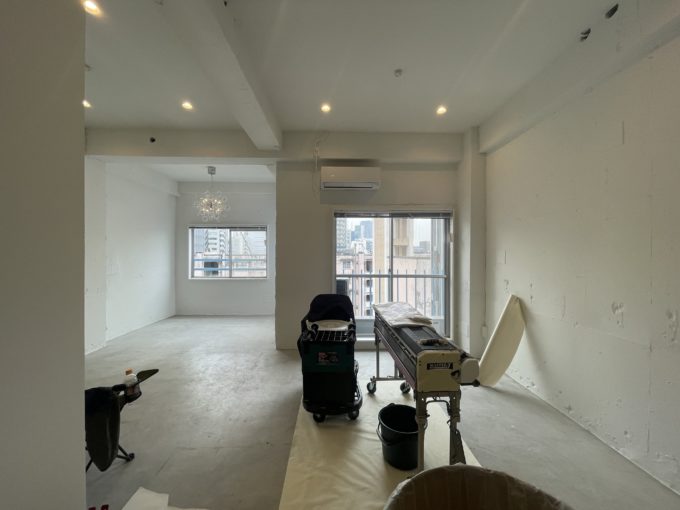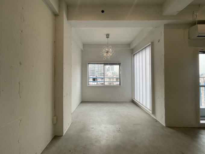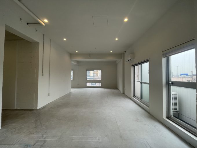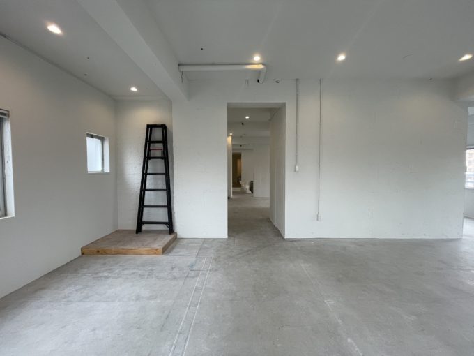 2020年に室内をフルリーのベーションしたこちら。エントランスや共用部もおしゃれにリノベされていて築50年ほどと思えないほど綺麗だ。前テナントが床をモルタルに変更しており、白壁×モルタルと非常に相性の良い空間に仕上がっている。天井はダウンライトとなっているが抜くこともご相談可能。区画割りも難しくなく様々な使い方が想像できる。