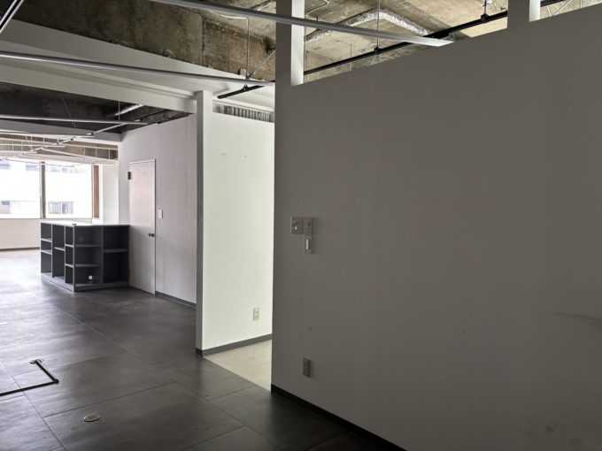 前テナントは美容系のオフィスで使われいたようで、その造作が一部残っています。壁付のデスク、ウォールシェルフ、入り口には受付棚、さらに完全な個室にはなっていませんが会議スペースの間仕切り壁もあります。什器備品など動産物だけ撤去された状態です。