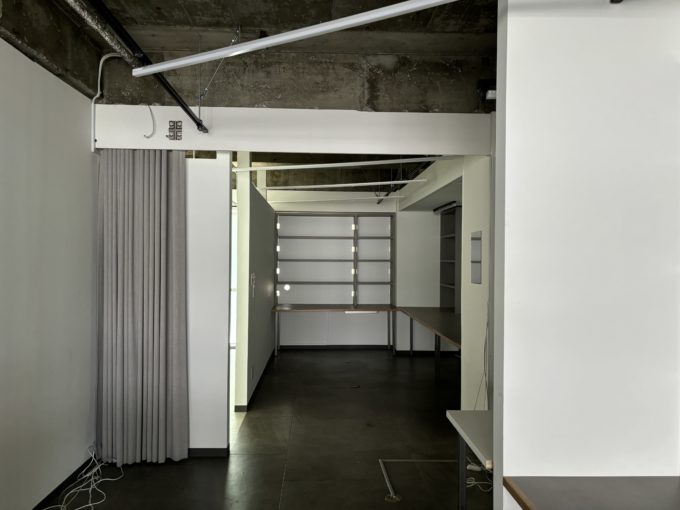 天井は抜けてコンクリートの躯体現し。天高は2.9mあり、スティック状のペンダントライトが斜めに交差するように吊り金具で吊るされています。壁は白塗装。床はグレーの塩ビシートのようです。