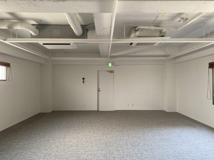 奥の執務スペースは、天井はスケルトンに白塗装、床はカーペットが敷かれたシンプルな空間が広がります。その天高は2.8mと、オフィスにしては開放感を追求しきったような高さです。手前側にはフォンブースが2箇所あって、リモート会議や集中したいときにはここも使えちゃいます。抜かりない。