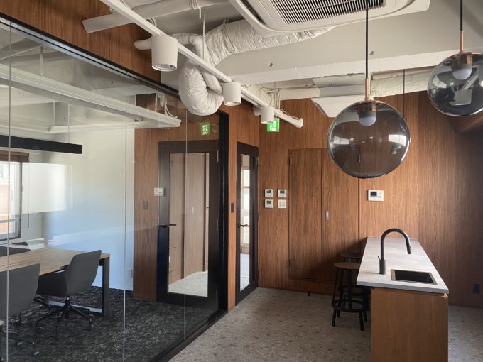 メインとなるスペースへのドアは会議室へそのまま入れる来客用と、メインスペースへと繋がるドアの二方向あります。会議室は6名分のスペース。会議室とバーカウンター、ラウンジの間はガラスで仕切られており、お互いの空間を見合うことも叶っちゃいます。お茶出しのタイミングとか、外から伺えるのって結構ありがたかったりしますよね。