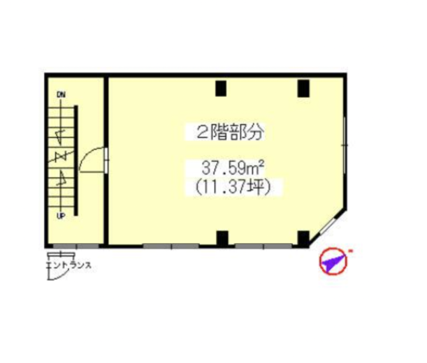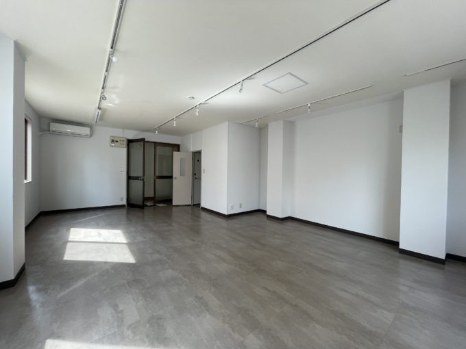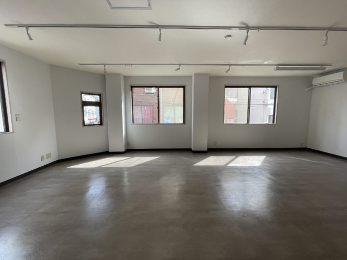 今回募集区画はワンフロアワンテナントの二階部分。商店街通り沿いに面しているが入口は脇になるため、ふらっと立ち寄るようなショップには難しそうだ。窓があり晴れていれば採光は充分だ。床は真新しいモルタル風なクッションフロアが貼られており、天井はスケルトンではなく、ライティングレールが設置されている。トイレはアンティーク風に改装されていてカワイイ。